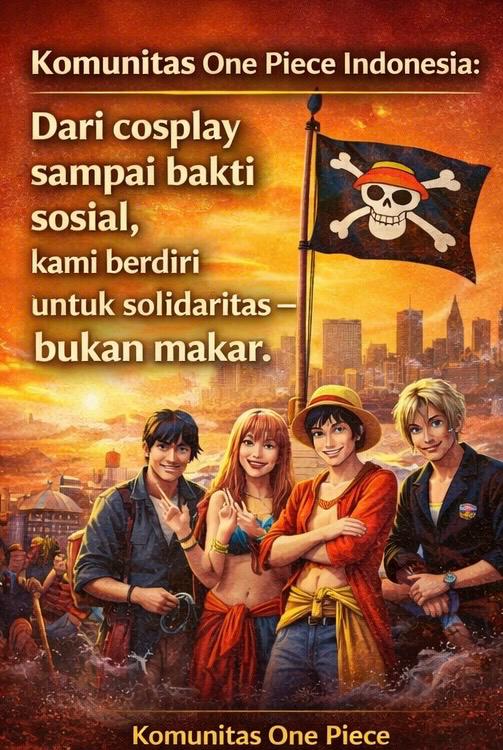 Komunitas One Piece Indonesia menyampaikan keprihatinan yang mendalam atas munculnya penggunaan bendera One Piece dalam sejumlah aksi unjuk rasa yang berujung anarkis. Bendera yang selama ini menjadi simbol kecintaan terhadap karya Eiichiro Oda dan semangat persahabatan antaranggota komunitas, tidak sepatutnya dikaitkan dengan aktivitas yang mengarah pada kekerasan, kerusuhan, maupun tindakan yang bertentangan dengan hukum.